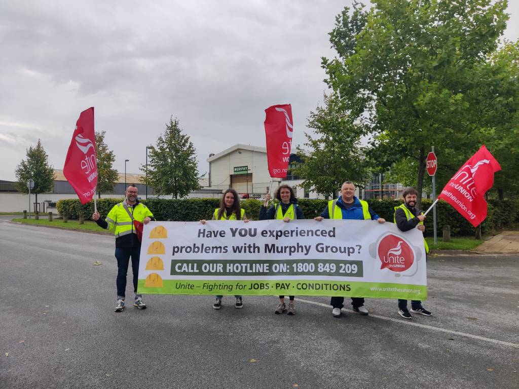 September 28th: Unite, which represents construction workers throughout Ireland, today (Thursday) launched a hotline for anyone concerned about the employment practices of the Murphy group. The launch took place outside the Newbridge headquarters of Murphy International Ltd.